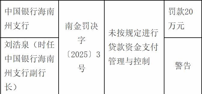 11月20日配资114平台查询,国家金融监督管理总局海南监管分局行政处罚信息公开表显示,中国银行海南州支行因未按规定进行贷款资金支付管理与控制被罚款20万元,刘某泉被警告。