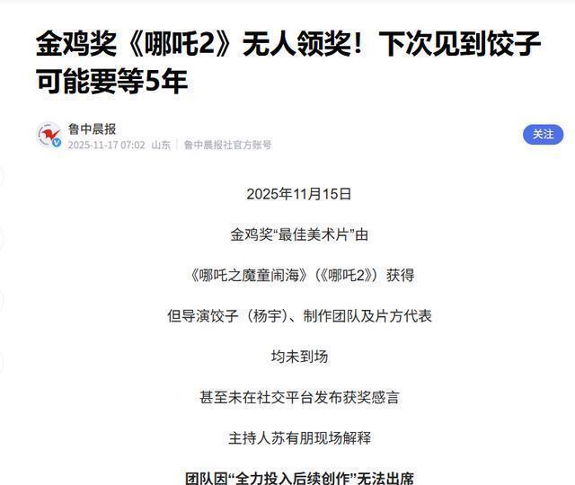 结语如今的饺子终于用实力来证明了自己。他也是网友们心中当之无愧的优秀创作者。信源来源:鲁中晨报 2025-11-17 金鸡奖《哪吒2》无人领奖!下次见到饺子可能要等5年